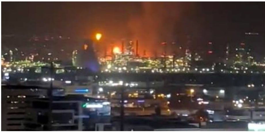 scene, reported by Haaretz, considered a Left-leaning Israeli newspaper, showed flames engulfing the refinery as emergency crews battled to contain the blaze.